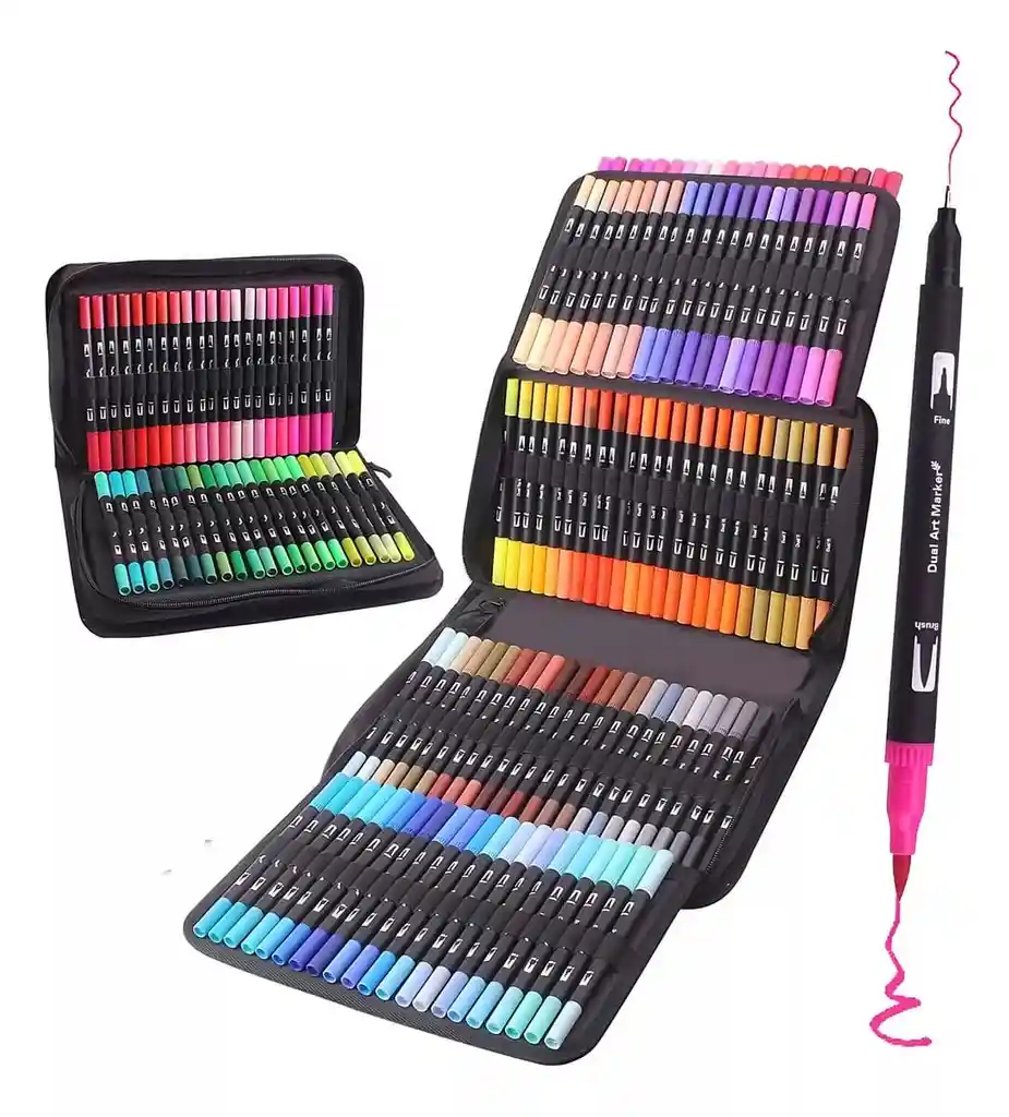 Estuche Marcadores Doble Punta Pincel - Lettering 120pcs 1. COLORES ÚNICOS: Bolígrafos de doble punta que facilitan la selección del tono adecuado. Adecuados para Letras, bocetos, dibujo y libros para colorear. Tonos intensos y vivos que estimulan la creatividad artística. 2. DISEÑO DE PUNTAS DUAL: Punta de pincel para colorear, sombrear, rellenar y mezclar; punta fina de 0,4mm para un control de línea detallado en dibujo, escritura y delineado. 3. Portátil: Los marcadores están organizados en una funda fácil de transportar, lo que permite una selección de colores cómoda y práctica. 4. Amplia aplicación: Adecuados para una variedad de usos, incluyendo libros de colorear para adultos, dibujo, escritura, garabateo y más. Apropiados para niños, adultos, educadores, estudiantes, principiantes y para uso en la escuela, viajes o en casa y oficina.