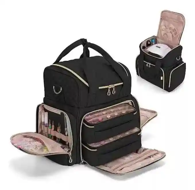 Estuche transporte para esmalte de uñas con caja de almacenamiento grande para herramientas e insumos, multifuncional, con bolsa de malla y costura duradera. El organizador para manicuristas, está hecho de microfibra de poliéster suave. El interior acolchado mantiene los frascos de esmalte de uñas en buen estado. Dimensiones: 30,5 cm x 17,5 cm x 23 cm/12,01 x 6,89 x 9,06 pulgadas. El almacenamiento inferior es un organizador de bolsa de maquillaje de viaje imprescindible, el compartimento inferior tiene 2 cajas extraíbles. Cada caja contiene 24 botellas de esmalte de uñas de 15 ml (0,5 fl oz). El divisor de esmaltes es flexible y extraíble. COMPARTIMIENTO SUPERIOR: Bolsa de cosméticos portátil con bolsillo de malla y parte superior elástica para secador de uñas estándar (dimensiones aproximadamente 9 x 7,5 x 4,5 pulgadas), quitaesmalte y otras herramientas. Tiene gran capacidad ya que los bolsillos laterales guardan pinceles para esmalte de uñas y otros accesorios. Un bolsillo interno transparente y un bolsillo trasero externo guardan accesorios adicionales. La bolsa de almacenamiento duradera y desmontable y la correa para el hombro ajustable ofrecen dos formas de transportarlo, con diseño minimalista. Las correas en parte posterior de la bolsa de cosméticos se puede fijar de forma segura al equipaje