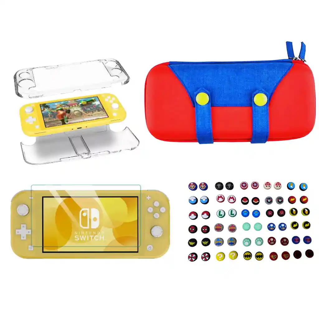 Esta compra incluye: - 1 Par de grips - 1 Vidrio templado - 1 Acrilico Transparente - 1 Estuche Case Rígido Nintendo Switch Lite Edicion Mario Bros Overol COMPATIBLE UNICAMENTE CON NINTENDO SWITCH LITE