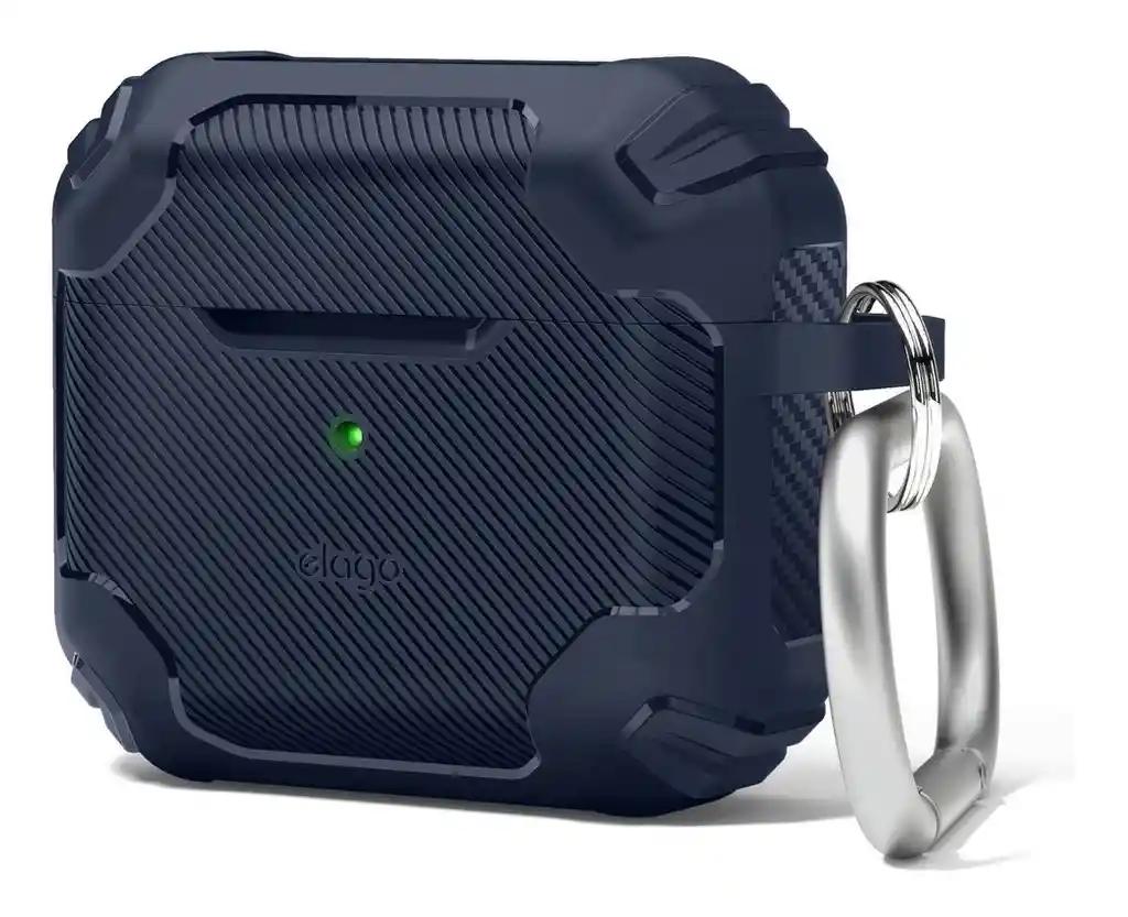 Estuche para AirPods 3 contra caídas Solid Armor Elago disponible en Azul Indico, todos nuestros estuches están diseñados en casa desde cero. Desde un concepto, hasta un producto terminado, todos los aspectos de la creación de un producto se realizan internamente para garantizar que obtenga un estuche que se adapte perfectamente, ayude a protegerse de las gotas y se vea excelente Características: - El diseño de armadura sólida ayudara a proteger su estuche de carga al brindar una increíble protección contra caídas proteja su dispositivo sin granel y tenga acceso a todas las funciones de su estuche de carga, como la carga inalámbrica. - El material de TPU premium protege su estuche de carga del uso diario, incluidos suciedad, aceite, rasguños, y gotas, polvo. Se incluye mosquetón para que puedas colgar el estuche de tu mochila, bolso, pantalones, etc Audifonos