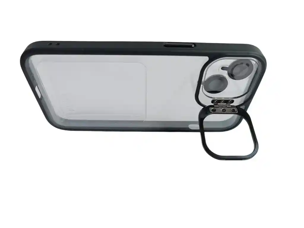 Estuche para iPhone 15 con kit de lentes y soporte de cámara disponible en Negro Esta carcasa de teléfono móvil utiliza materiales combinados de TPU y acrílico, por lo que toda la carcasa es suave. La parte del borde adopta un material suave, que puede absorber y reducir eficazmente la fuerza de impacto de la caída del teléfono y proporcionar una mejor protección contra caídas. Características: - El área de la cámara está protegida porque sobresale un soporte que te ayudara a que no quede sobre la superficie y puedas parar el celular de forma horizontal y ver tus series y películas favoritas. - Los botones cromados de tecnología independiente que se presionan fácilmente le brindan una sensación suave de retroalimentación. - Esta carcasa de teléfono móvil utiliza materiales combinados de TPU y acrílico. - Proporcionar una mejor protección contra caídas del dispositivo. - Combina el estuche transparente con el color del dispositivo y ponle un diseño único. - Adicional se incluye dos lentes de cámara del mismo color del estuche.
