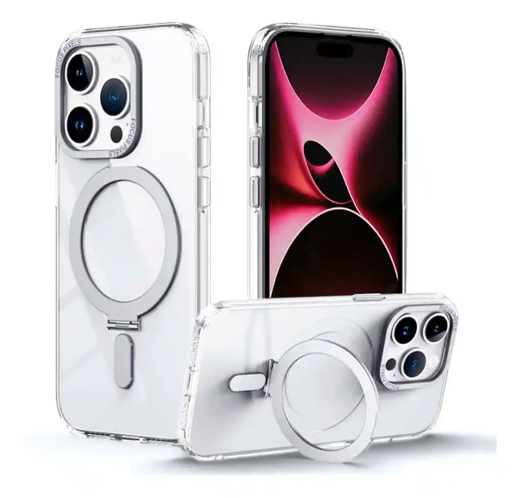 Estuche Para iPhone 15 Pro Max Focus Magsafe Con Soporte 360º disponible en Silver, Se alinea perfectamente y ofrece una experiencia de conexión mágica y una carga inalámbrica más rápida en todo momento. Simplemente, mantenga la funda y coloque sus accesorios Magsafe, como el cargador, la batería y la billetera. Está hecho de una parte posterior de PC mate y un marco de TPU flexible. Las 4 esquinas están equipadas con bolsas de aire y absorción de impactos de 360°, bordes de pantalla mejorados de 1,5 mm, biseles de cámara de 2,5 mm y bolsas de aire con lentes de 360° mejoradas que protegen la cámara y la pantalla del ajetreo diario. Hecha de policarbonato especialmente curtido y acabado, la parte exterior de la funda se siente suave al tacto y desarrolla una pátina natural con el tiempo.