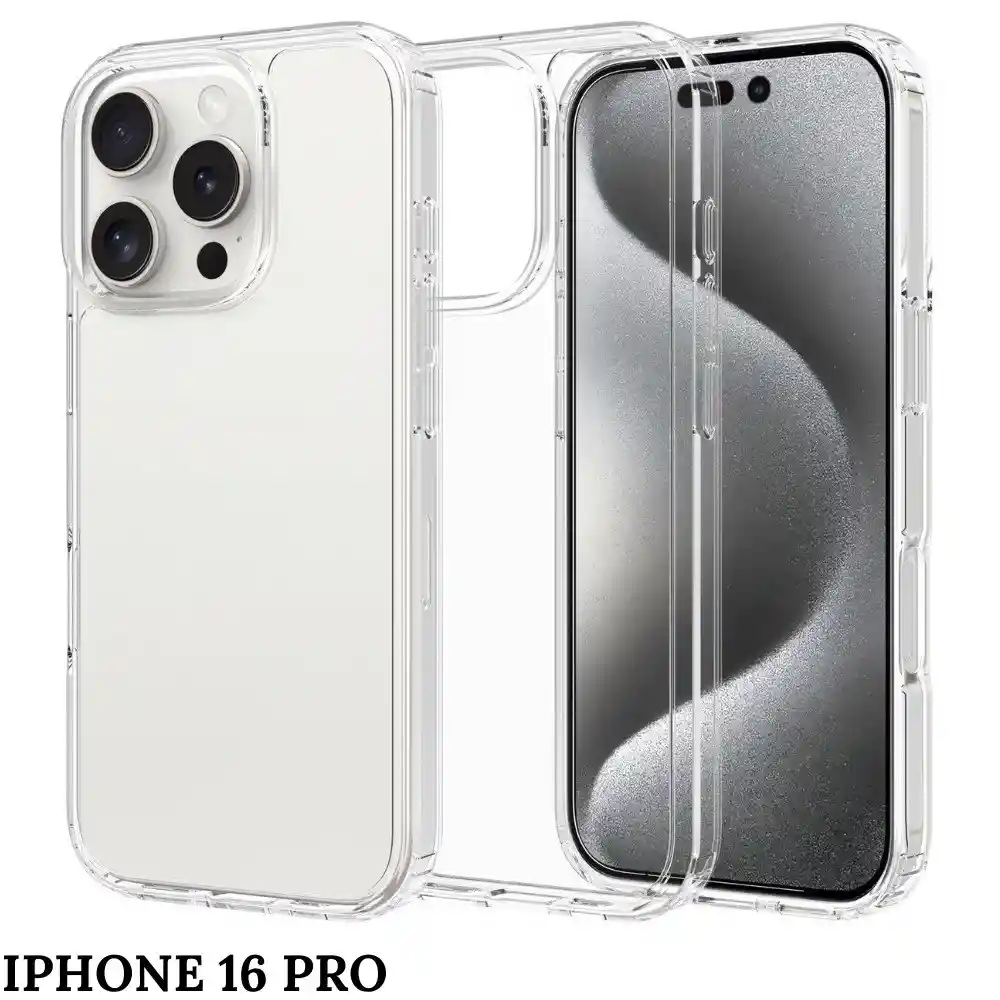 Estuche funda transparente para iPhone 16 Pro, en silicona de excelente calidad CARACTERÍSTICAS: - Excelente protección con una goma de alta calidad. - Esquina curva para mejorar el agarre - No se pega en los bolsillos - Cada orificio viene muy bien detallado y ajustado a los botones o cámaras del celular Proteja su celular aumentando la resistencia de golpes y caídas con esta linda funda que conserva el color original del teléfono, no raya tu equipo y además es muy cómoda por su flexibilidad.
