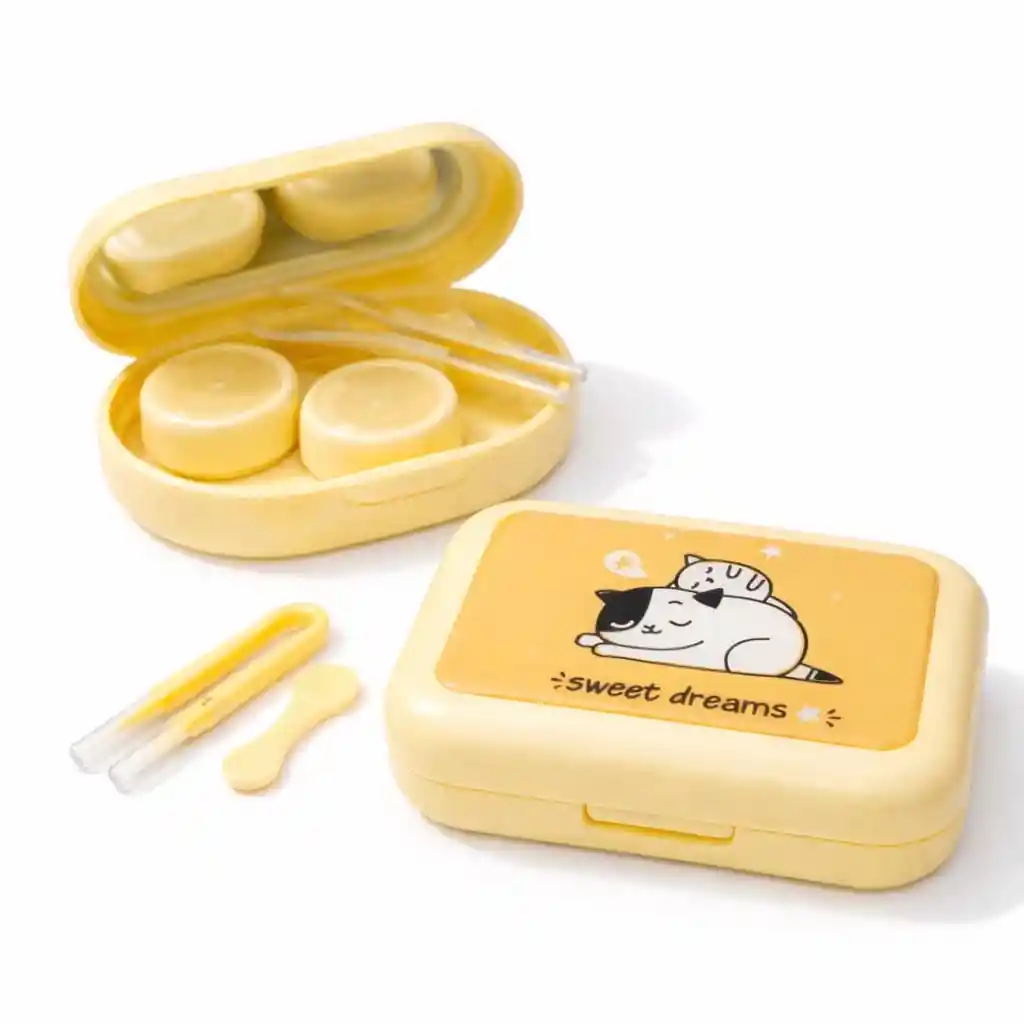 ✓Diseño Lindo de Gatos: Estuche color amarillo con una tierna ilustración de un gato durmiendo y un pequeño gatito sobre él. ¡Un toque perfecto de ternura para tu rutina diaria! ✓Accesorios Completos: Incluye pinzas, un aplicador y compartimentos etiquetados "L" y "R" para mantener tus lentes de contacto organizados y seguros. ✓Compacto y Portátil: Perfecto para llevar en tu bolso, mochila o estuche de viaje. Ideal para el uso diario o cuando estás en movimiento.