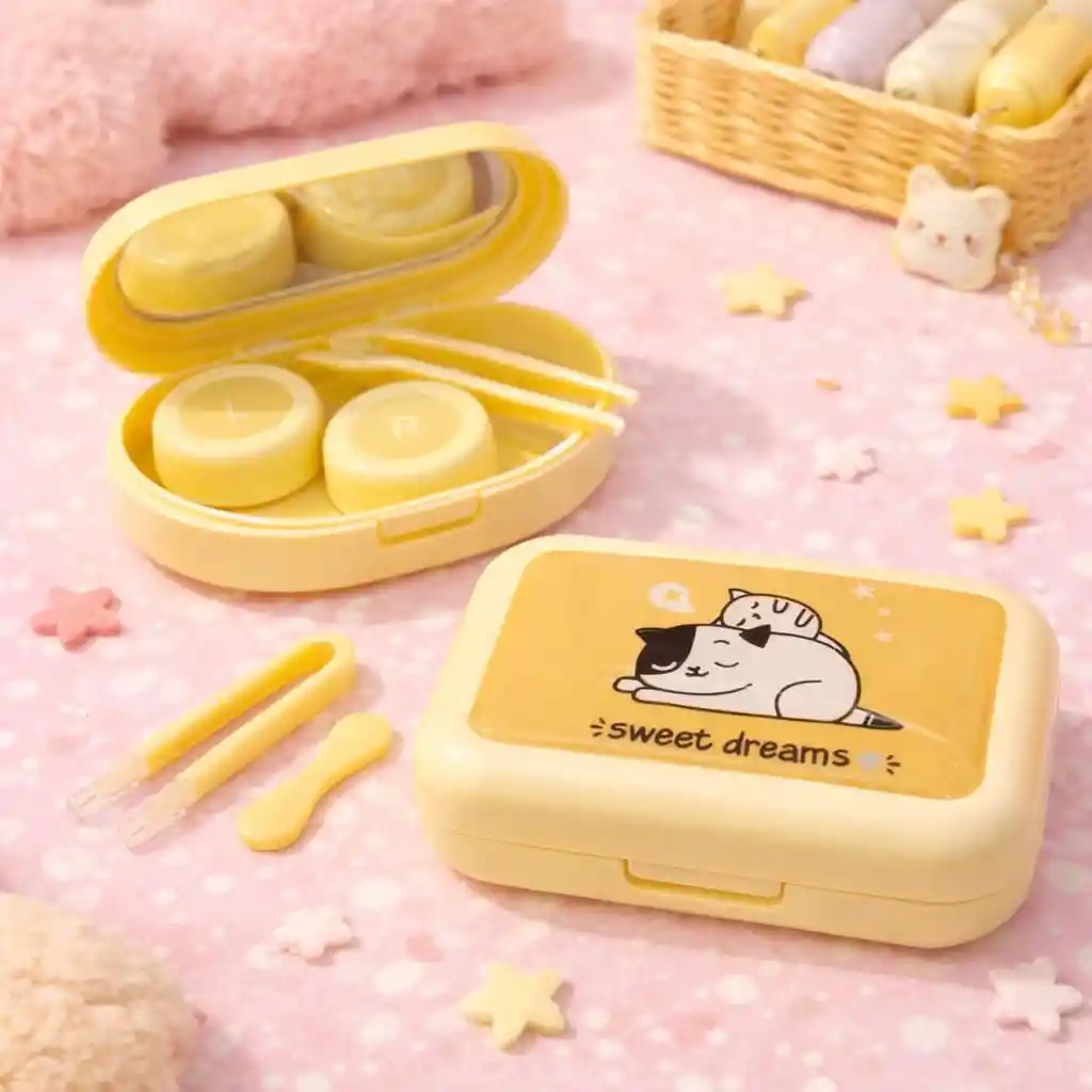 ¡Haz que tus lentes de contacto sean más adorables con este estuche único! ✓Diseño Lindo de Gatos: Estuche color amarillo con una tierna ilustración de un gato durmiendo y un pequeño gatito sobre él. ¡Un toque perfecto de ternura para tu rutina diaria! ✓Accesorios Completos: Incluye pinzas, un aplicador y compartimentos etiquetados "L" y "R" para mantener tus lentes de contacto organizados y seguros. ✓Compacto y Portátil: Perfecto para llevar en tu bolso, mochila o estuche de viaje. Ideal para el uso diario o cuando estás en movimiento.