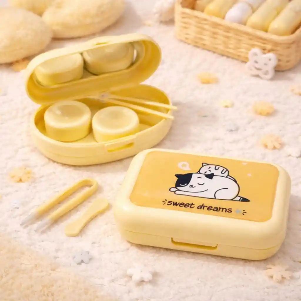 ¡Haz que tus lentes de contacto sean más adorables con este estuche único! ✓Diseño Lindo de Gatos: Estuche color amarillo con una tierna ilustración de un gato durmiendo y un pequeño gatito sobre él. ¡Un toque perfecto de ternura para tu rutina diaria! ✓Accesorios Completos: Incluye pinzas, un aplicador y compartimentos etiquetados "L" y "R" para mantener tus lentes de contacto organizados y seguros. ✓Compacto y Portátil: Perfecto para llevar en tu bolso, mochila o estuche de viaje. Ideal para el uso diario o cuando estás en movimiento.