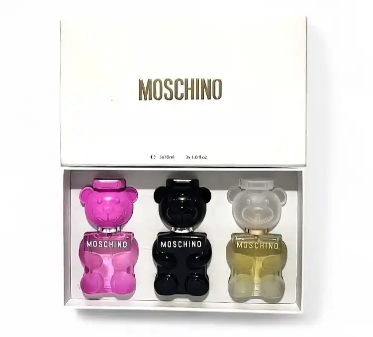 Estuche Moschino Toy de 30ml es un set coleccionable con el icónico frasco en forma de osito de peluche, que alberga fragancias como: Toy Boy (amaderada especiada para hombres) con pimienta rosa, clavo y maderas, Toy 2 (floral cítrica para mujeres) con magnolia, peonía y almizcle, y Toy 2 Bubble Gum (dulce floral) con chicle, rosa y frutas, ofreciendo una experiencia olfativa divertida y de lujo. *Perfumes premium 1:1