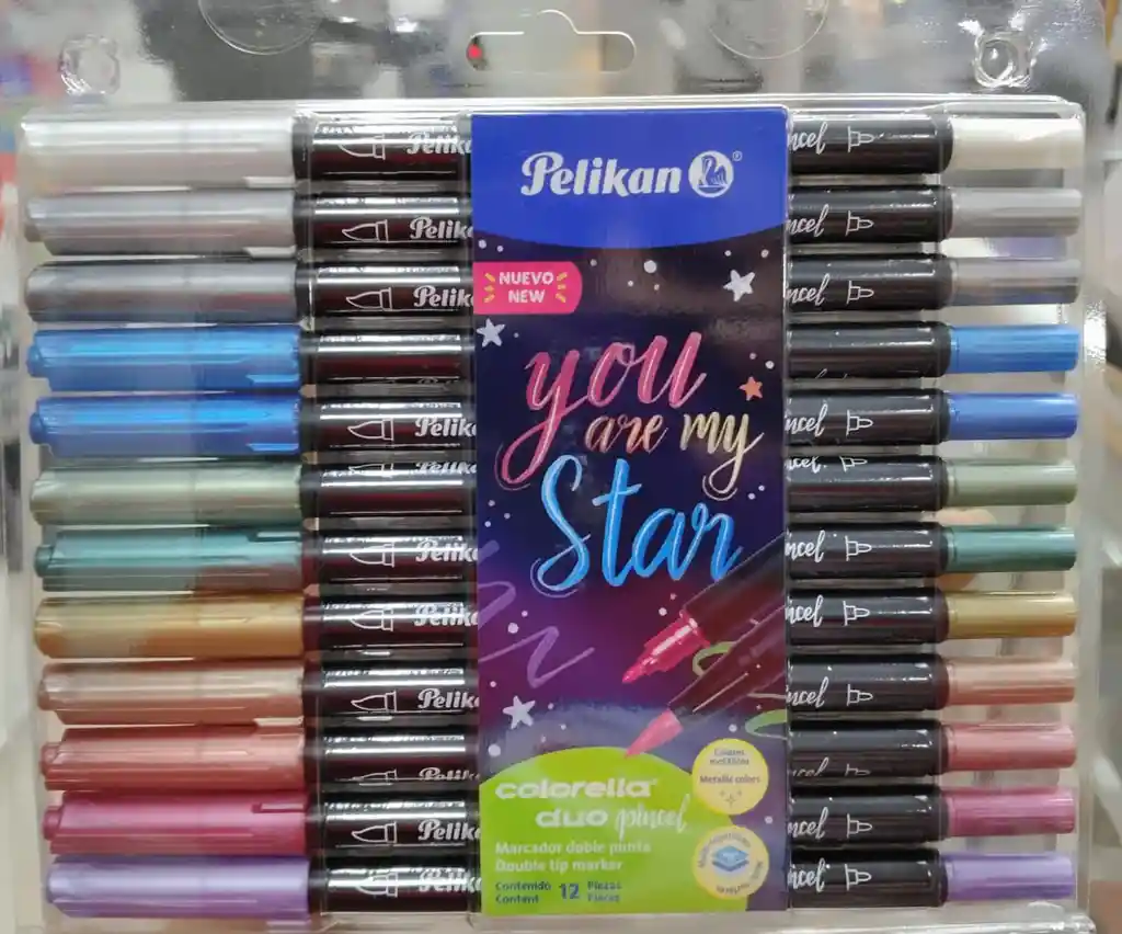 Marcador con doble punta: pincel y fina. Tinta pigmentada metálica base agua. Ideal para lettering Traza líneas finas y gruesas. Pinta en superficies oscuras. Colores metálicos. No tóxicos.
