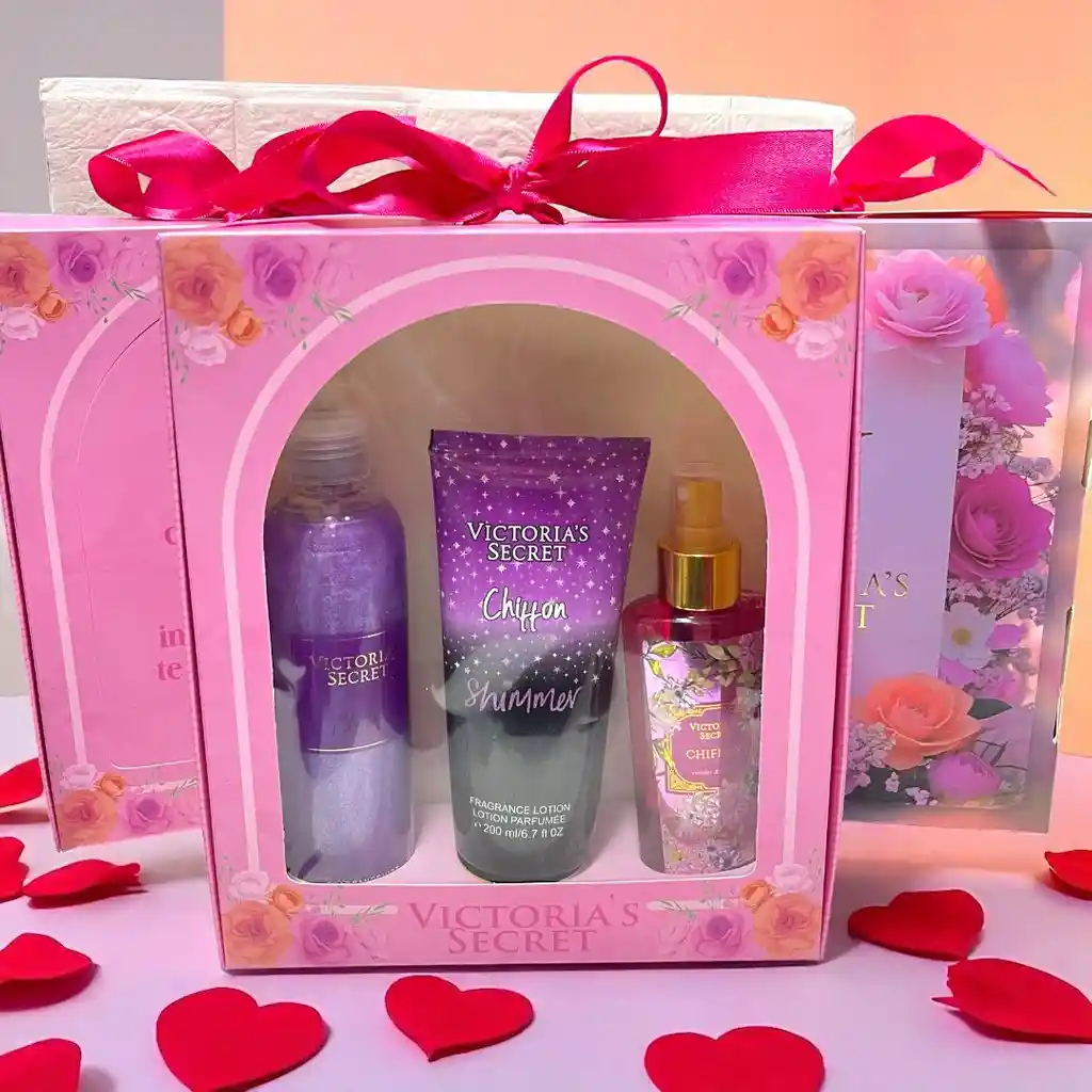 NUEVO DISEÑO ESTUCHE VICTORIA SECRET IDEAL PARA UN DETALLE ,REGALO. SI QUIERES SORPRENDER FECHAS ESPECIALES. con este estuche no necesitas preocuparte por bolsa ni tarjeta ya que es muy completo , contiene * Splash 250ml Splash mini 125ml crema de 200 ml Tarjeta Incluida medidas caja 25 cm