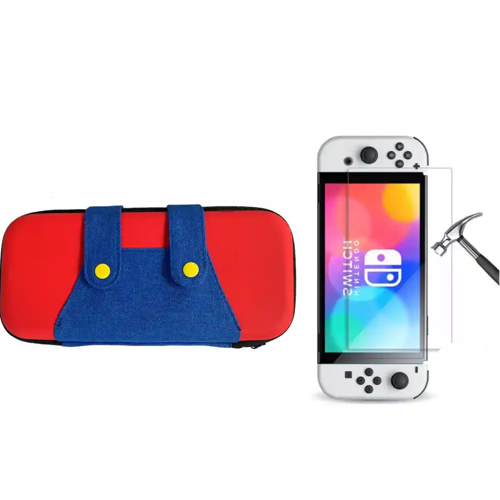 Estuche Rigido Mario Overol + Vidrio Protector Compatible Con Switch Oled