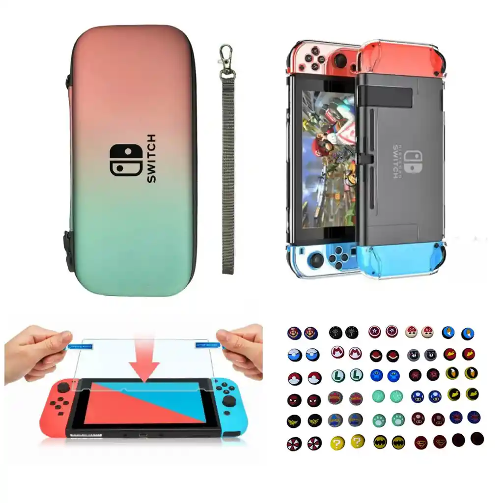 Estuche Rígido Rosa/ Azul Pastel + Acrilico + Vidrio + 2 Grips Compatible Con Switch