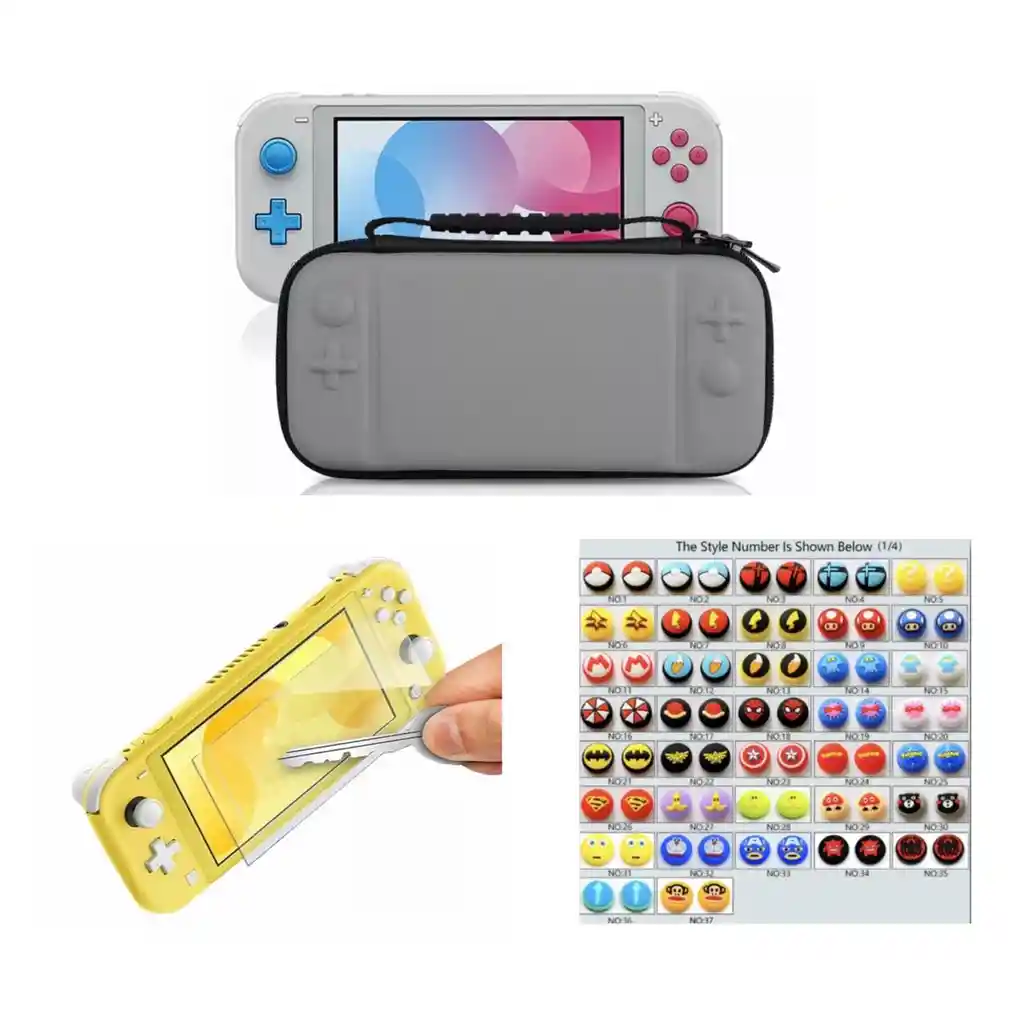 *¡¡BIENVENIDO A ATARISTATION!!* 1. CARACTERISTICAS DE LA COMPRA: 1.1 Esta compra incluye: - 1 Estuche Rigido Siwtch Lite Color Gris + Vidrio Protector + 2 Grips 1.2 Características del producto Estuche Rígido Compatible con Nintendo Switch Lite + 2 Vidrios Protectores Mantén tu consola protegida y lista para llevar a cualquier lugar con este kit de protección para Nintendo Switch Lite. Incluye un estuche rígido resistente y 2 vidrios protectores de pantalla, ideales para cuidar tu consola contra golpes, rayones y polvo. El estuche está diseñado especialmente para la Switch Lite, ofreciendo un ajuste perfecto y un interior acolchado que protege la consola durante el transporte. Además, los vidrios protectores ayudan a mantener la pantalla en excelente estado sin afectar la sensibilidad táctil ni la calidad de imagen.