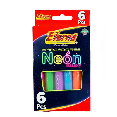 Caja Con 6 Unidades. Marcadores Acrílicos Neón Galaxy Eterna. Diviértete Con Tus Marcadores Neón, Perfectos Para Decorar, Escribir y Crear Diseños Espectaculares en Cualquier Tipo de Papel. Los Puedes Usar en Cualquier Tipo de Superficie Dan un Trazo Ideal Para Carteleras, Tableros Luminosos Entre Otros. En Superficies Oscuras Realza el Color Vienen en 6 Colores Diferentes: Azul, Morado, Verde Amarillo, Naranja y Rosado Colores Intensos y Vibrantes.