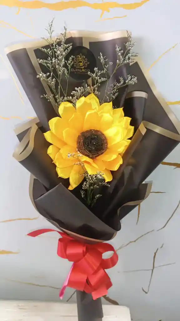 Hermoso arreglo de 1 girasol eterno con su respectivo follaje, envoltura en papel coreano color amarillo y un elegante y delicado moño