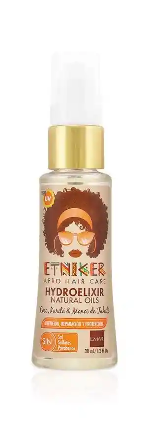 Hydroelixir Etniker es un producto capilar en aceite formado por una combinación de 13 óleos nutrifuncionales naturales pensado para hidratar, nutrir, proteger y reparar el cabello desde la raíz hasta las puntas. Está enriquecido con aceites naturales como coco, karité, oliva, macadamia, monoï de Tahití y otros, que nutren las capas más profundas de la fibra capilar, aportan humectación esencial, brillo y vitalidad sin dejar efecto graso, ayudan a controlar el frizz y dan vida al cabello seco, poroso o dañado. Puede aplicarse sobre cabello húmedo o seco según tu rutina, y se usa en pequeñas cantidades distribuidas especialmente en puntas y zonas porosas para maximizar sus beneficios.