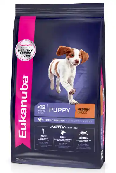 Nuestra exclusiva fórmula Growing Puppy está elaborada para promover la condición corporal óptima y promover el desarrollo y el crecimiento sano. Apto para cachorros de razas medianas hasta los 12 meses. Nuestra croqueta sabrosa rica en pollo fresco ha sido adaptada especialmente para satisfacer las necesidades de los perros de raza mediana. Además su forma hexagonal especial también ayuda a cuidar los dientes de tu perro. Desarrollado por nutricionistas aprobado por veterinarios y recomendado por los mejores criadores EUKANUBA proporciona toda la nutrición que tu perro necesita para una vida larga y sana. Cuando llega el momento para tu cachorro de cambiar fórmula nuestros expertos recomiendan alimentarlo con nuestra receta Active Adult para perros de razas medianas. BENEFICIOS CLAVE: -DHA para favorecer el aprendizaje de los cachorros y ser más trainables. -Prebióticos FOS y pulpa de remolacha para favorecer una digestión saludable. -Vitaminas E y C antioxidantes para ayudar al sistema inmune. -Calcio para ayudar al desarrollo óseo. -Fuentes naturales de Omega 6 y 3 para una piel y un pelo sanos. -Una forma de croqueta especial con DentaDefense para mantener los dientes limpios y sanos
