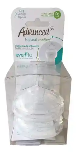 Mamila de cuello ancho y de flujo medio. Cuenta con tecnología de doble válvula anticólicos que regula la presión del aire al interior de la botella permitiendo un flujo continuo y natural