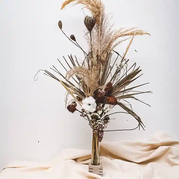 Solitario de flores secas exóticas para decorar tus espacios. Viene con una base para sostener el solitario.