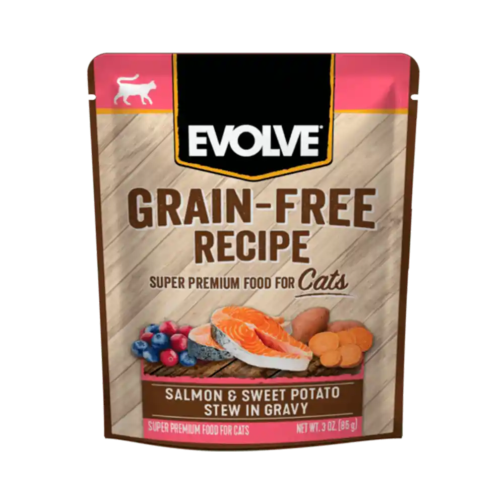 Alimento Húmedo Premium Para Gatos de Todas Las Razas Sabor a Salmón y Batata. Contiene una alta calidad de proteína, minerales, vitaminas y carbohidratos.