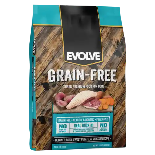 ALIMENTO SECO CON PROTEINA DE PATO 100% REAL Y FRESCO, NATURAL, SUPER PREMIUM , LIBRE DE GRANOS Y SALUDABLE. No es All life stages. PROTEÍNA CRUDA, Mínimo 35.0% GRASA CRUDA, Mínimo 18.0% Proteína 100% PATO como primer ingrediente, fuentes de proteina adcional como Carne de Venado, harina de Pescado, harina de Pavo que son fuentes de carbohidratos no provenientes de cereal, menos proceso de cocción sobre dichos ingredientes, fuentes de carbohidratos basados en legumbres, su aporte de calorias favorece al control de peso y curva de glicemia. De igual forma su aporte en fibra favorece al proceso de saciedad, creando un ambiente favorable para la microbiota intestinal. Aseguran balance de óptimo de ácidos grasos omega 3 y 6, óptima digestión basada en fibra de raíz achicoria, la cual cuenta con sólido respaldo científico en su relación favorable para la digestión, gestión de azúcar en sangre y control de peso. Sabores e ingredientes naturales aseguran buen manejo de palatabilidad. EVOLVE GRAIN FREE es un alimento que no incorpora cereales en su dieta, ademas cumple con todas las características de un alimento natural.