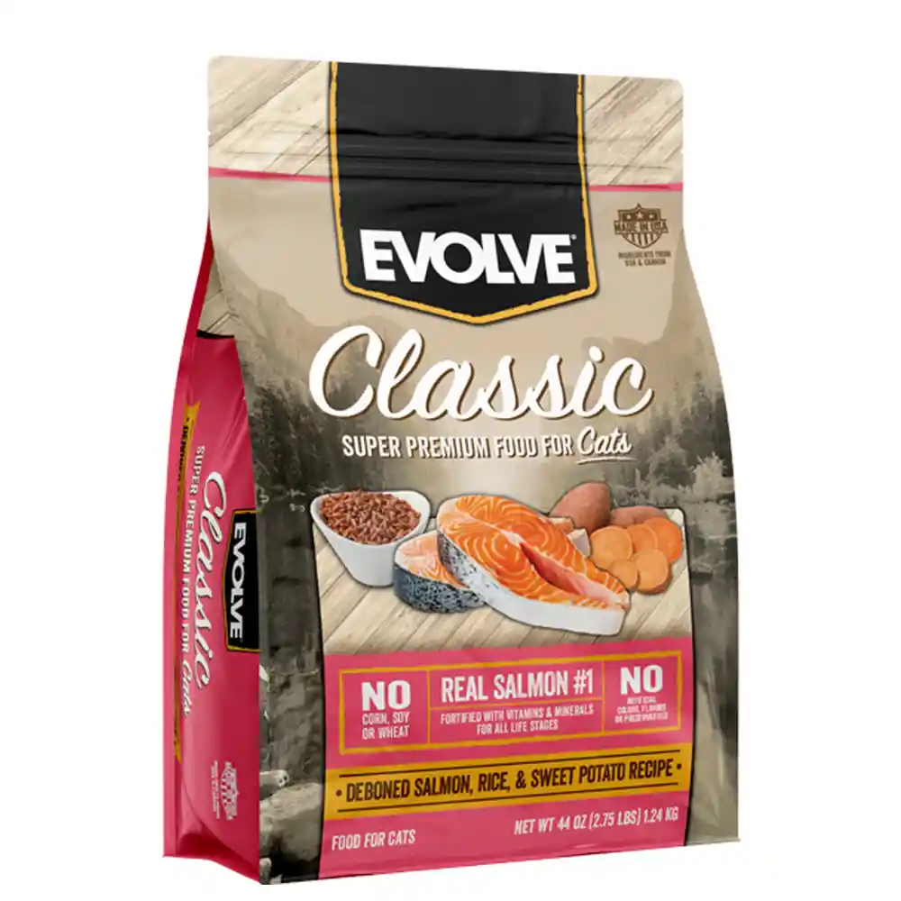 Evolve Cat Classic Salmon es un alimento seco para gatos diseñado para todas las etapas de la vida. Este producto utiliza salmón deshuesado como ingrediente principal, proporcionando proteínas de alta calidad para músculos fuertes y magros. También incluye arroz integral y camote, ofreciendo carbohidratos complejos y nutrientes esenciales.