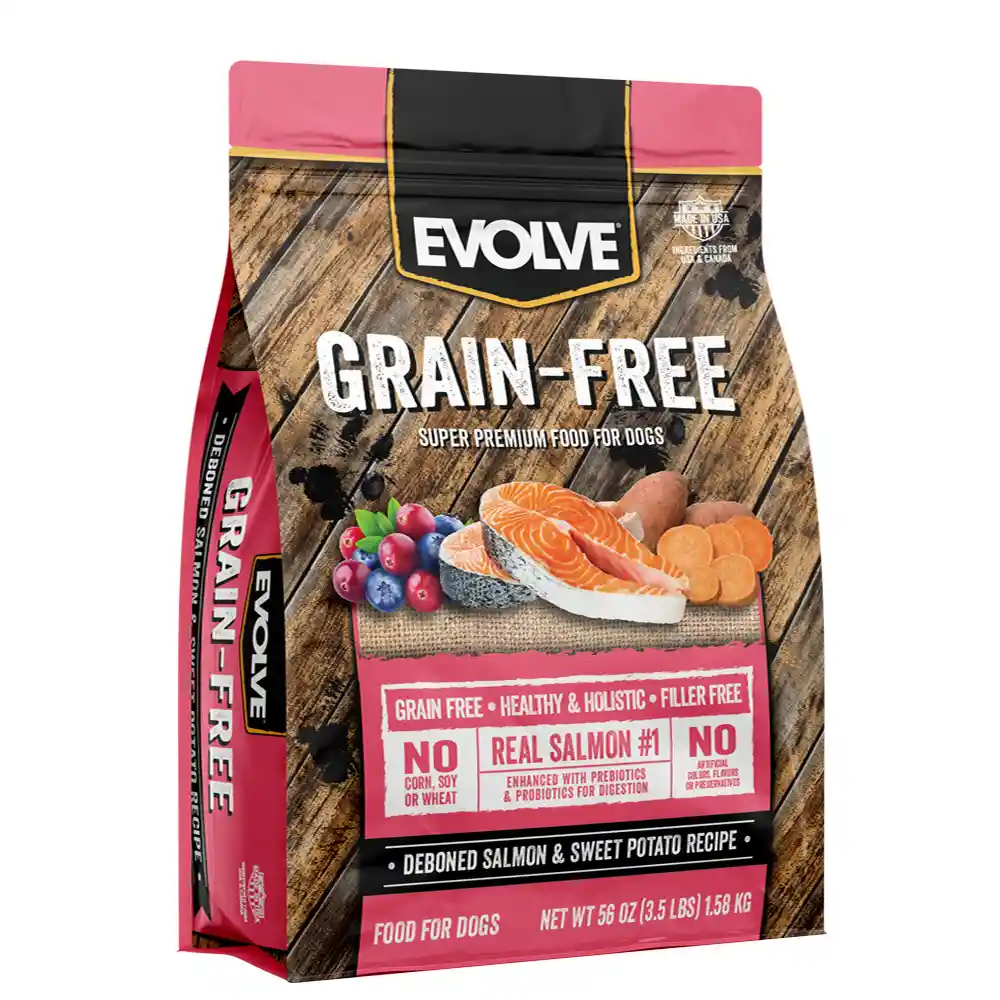 Evolve Grain Free Salmon & Sweet Potato es un alimento para perros diseñado para todas las etapas de vida. Está elaborado con salmón deshuesado como ingrediente principal, lo que satisface los instintos naturales de tu perro. Además, incluye camote y otros ingredientes saludables como frutas, verduras, vitaminas y minerales, que ayudan a mantener un sistema inmunológico fuerte, una piel saludable y un pelaje brillante.