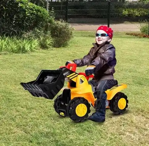 Excavadora fisher price, emite sonidos y tiene un compartimiento para guardar cosas.