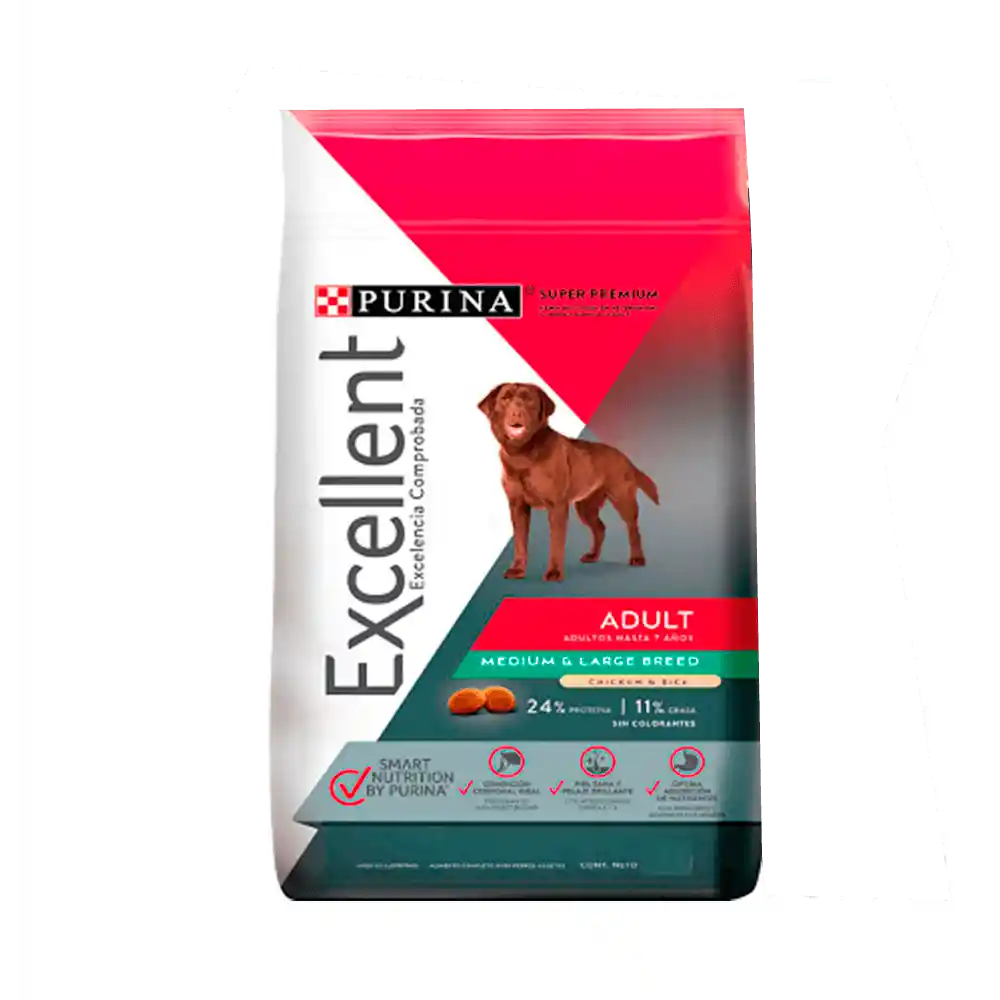 Los perros adultos tienen diferentes necesidades nutricionales que los cachorros o los perros maduros. PURINA® Excellent® ADULTOS POLLO Y ARROZ RAZAS MEDIANAS Y GRANDES ofrece una fórmula completa que incluye aminoácidos esenciales, inulina, vitaminas, minerales y zeolita, aportando un óptimo balance nutricional y un sabor irresistible.