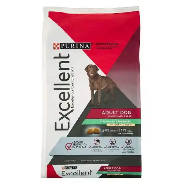 Purina Excellent Alimento seco Adultos Pollo y Arroz Razas Medianas y grandes Los perros adultos tienen diferentes necesidades nutricionales que los cachorros o los perros maduros. PURINA Excellent ADULTOS POLLO Y ARROZ RAZAS MEDIANAS Y GRANDES ofrece una fórmula completa que incluye aminoácidos esenciales, inulina, vitaminas, minerales y zeolita, aportando un óptimo balance nutricional y un sabor irresistible