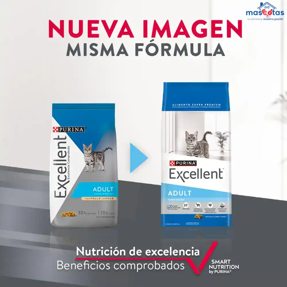 PURINA® Excellent® Adulto Pollo y Arroz, ofrece una fórmula con una óptima combinación de ingredientes, proteínas de alta digestibilidad y ácidos grasos omega 3 y 6, para mantener al máximo la salud del gato adulto. CONDICIÓN CORPORAL IDEAL La utilización de fuentes de proteínas de elevada digestibilidad garantiza el aporte de aminoácidos esenciales que ayudan a mantener músculos fuertes y sanos. Así́, cualquiera sea el nivel de actividad física de tu gato, puedes estar seguro de que sus necesidades proteicas estarán satisfechas. TRACTO URINARIO SALUDABLE Una óptima combinación de ingredientes ayuda a mantener un pH adecuado en la orina, el cual contribuye a la reducción de la formación de cálculos y cristales, colaborando con el mantenimiento de un tracto urinario saludable, fundamental para la salud de tu gato. PIEL SANA Y PELAJE BRILLANTE La combinación de los ácidos grasos Omega 6 y 3 junto a vitaminas y minerales favorecen la salud de la piel y un pelaje brillante, primera señal de una salud general adecuada.