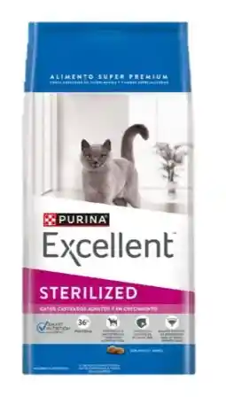 Descripción Los gatos castrados, sean adultos o estén en crecimiento necesitan una nutrición especifica. PURINA® EXCELLENT® STERILIZED es un alimento completo y balanceado que ofrece una combinación de ingredientes adecuada para obtener una condición corporal ideal, ayudando en el control de bolas de pelo y manteniendo un tracto urinario saludable. Balance adecuado de ingredientes para un tracto urinario saludable: Una óptima combinación de ingredientes que ayuda a mantener un pH adecuado en la orina, contribuyendo a la reducción de la formación de cálculos y cristales, y al mantenimiento de un tracto urinario saludable. Contribuye a una condición corporal ideal: Con fuentes de proteínas de elevada digestibilidad que garantizan el aporte de aminoácidos esenciales, ayudando a mantener músculos fuertes y sanos. Favorece el control de bolas de pelo: Con probiótico natural y fibras naturales que ayudan a eliminar las bolas de pelo producidas al lamerse.
