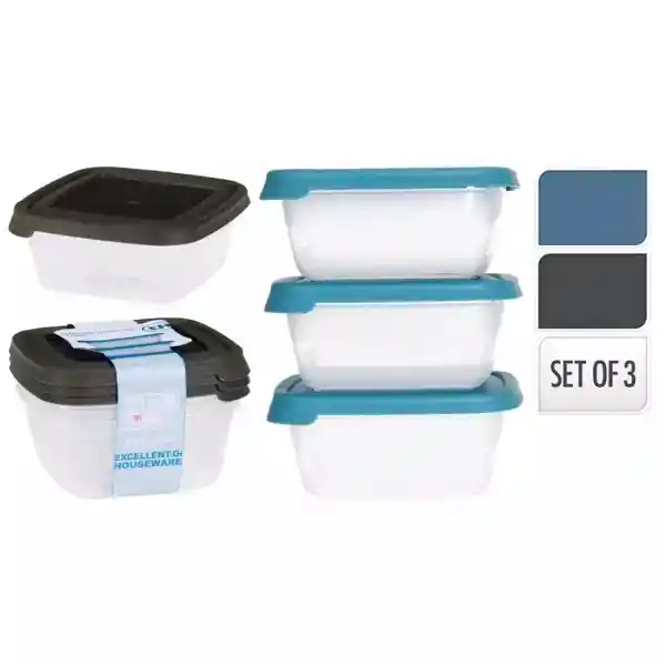 Set Excellent Houseware Contiene 3 Unidades. Plástico Surtido 024000220. Caja de Almacenamiento Juego de 3 Piezas Con Tapa 2 Colores Surtidos Cuadrado Transparente Con Tapa de Color 3X 500 mL / 1691 oz 130 x 130 x 85 cm Peso 141 Gramo Con el Color de la Funda. 2 Colores (Azul 5415C / Gris 425C) / 130 x 130 x 85 cm Manga 3 x Piezas 500 mL + Tapa Polipropileno. Los Productos Marcados Como Producto Surtido Pueden no Ser Idénticos a Los Que Aparecen Publicados en Las Imágenes Las Imágenes Son Ilustrativas al Comprar un Producto Identificado Como Producto Surtido Aceptas Que Podrás Recibir un Producto Con Características y Atributos Tangibles Diferentes a Los Que Aparecen en Las Imágenes Del Sitio o la Publicidad Los Productos Surtidos Mantendrán Las Propiedades Físicas Químicas y Técnicas Necesarias Para su Funcionamiento y Uso de Acuerdo a su Naturaleza.