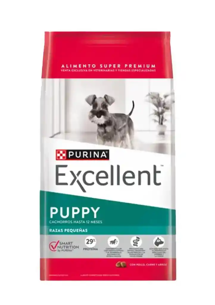 En su primer año de vida los cachorros necesitan una nutrición óptima para favorecer su desarrollo y crecimiento. PURINA® Excellent® CACHORROS POLLO Y ARROZ RAZAS PEQUEÑAS ofrece una fórmula completa y balanceada a base de proteínas de alta calidad,incluyendo tocoferoles mezclados -fuente de vitamina E- y sin colorantes ni saborizantes artificiales, para garantizar la calidad nutricional de sus fórmulas y un sabor único e irresistible. Características: PROTEÍNAS DE ALTA DIGESTIBILIDAD Los perros de tamaño pequeño tienen altos requerimientos proteicos. La utilización de fuentes de proteínas de elevada digestibilidad garantiza el aporte de aminoácidos esenciales que ayudan a mantener músculos fuertes y sanos. Así, cualquiera que sea el nivel de actividad física de su perro, usted puede estar seguro de que sus necesidades proteicas estarán satisfechas. CONTIENE PREBIÓTICOS La inclusión de inulina, un ingrediente de origen natural con función prebiótica ayuda a optimizar la población de bacterias benéficas en el intestino, colaborando con una mayor salud digestiva, y mejorando la absorción de nutrientes clave como vitaminas y minerales. EQUILIBRIO DE CALCIO Y FÓSFORO El aporte de estos minerales clave en proporciones adecuadas ayuda al desarrollo de dientes y huesos saludables. PARTÍCULA FÁCIL DE MORDER La inclusión de croquetas de tamaño adecuado permite a los perros de tamaño pequeño tener una masticación confortable, ajustada específicamente a su mordida.
