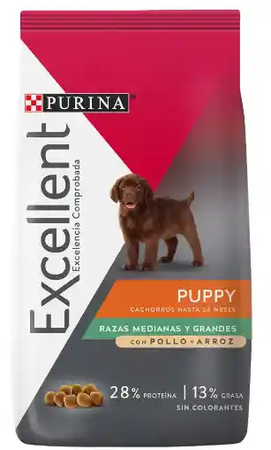 PURINA® Excellent® CACHORROS POLLO Y ARROZ RAZAS MEDIANAS Y GRANDES ofrece una fórmula completa y balanceada a base de proteínas de alta calidad, incluyendo tocoferoles mezclados -fuente de vitamina E- y sin colorantes ni saborizantes artificiales, para garantizar la calidad nutricional de sus fórmulas y un sabor único e irresistible.