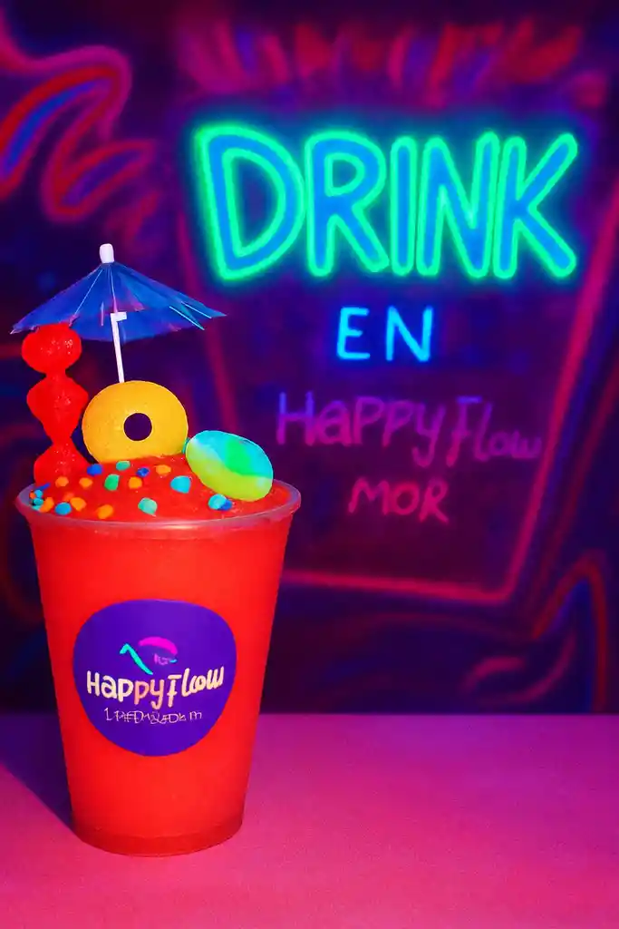 Granizado de Bom fresa con whisky, 3 toppings: oka loka, gomas de aros trululu y labios rojos.