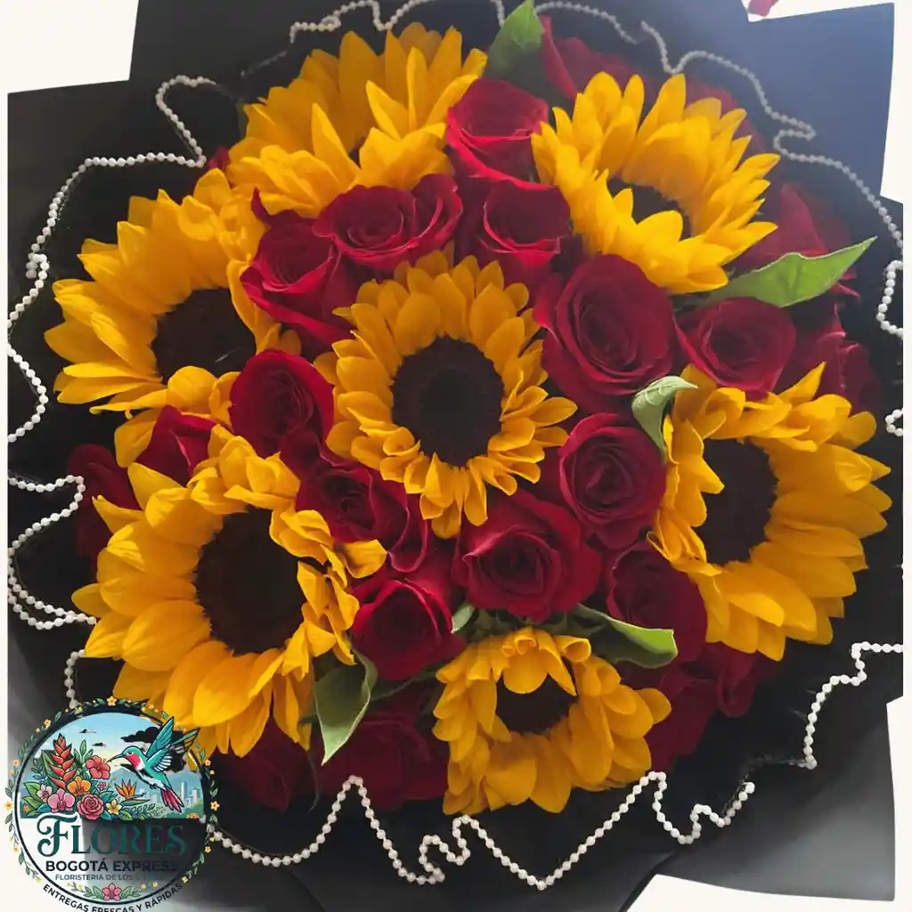 Un bouquet vibrante que combina la intensidad del amor con la energía de la felicidad. Este hermoso arreglo reúne 24 rosas rojas de tallo perfecto junto a 6 girasoles radiantes, creando un contraste espectacular que transmite pasión, alegría y admiración. Diseñado en un elegante empaque que resalta cada flor, este ramo es ideal para sorprender con un detalle lleno de vida y significado. Los girasoles iluminan el momento, mientras las rosas rojas expresan un amor profundo y sincero. Perfecto para cumpleaños, aniversarios o para alegrarle el día a alguien especial en Bogotá con un regalo que impacta a primera vista.