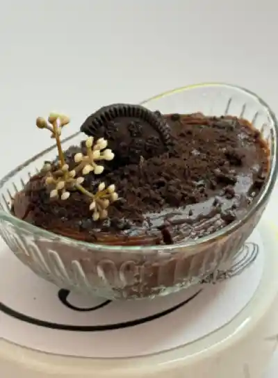 Postre con base de torta de chocolate bañada con un suave almíbar, con una capa de crema de chocolate y finalizado con salsa de chocolate y crocante de chocolate