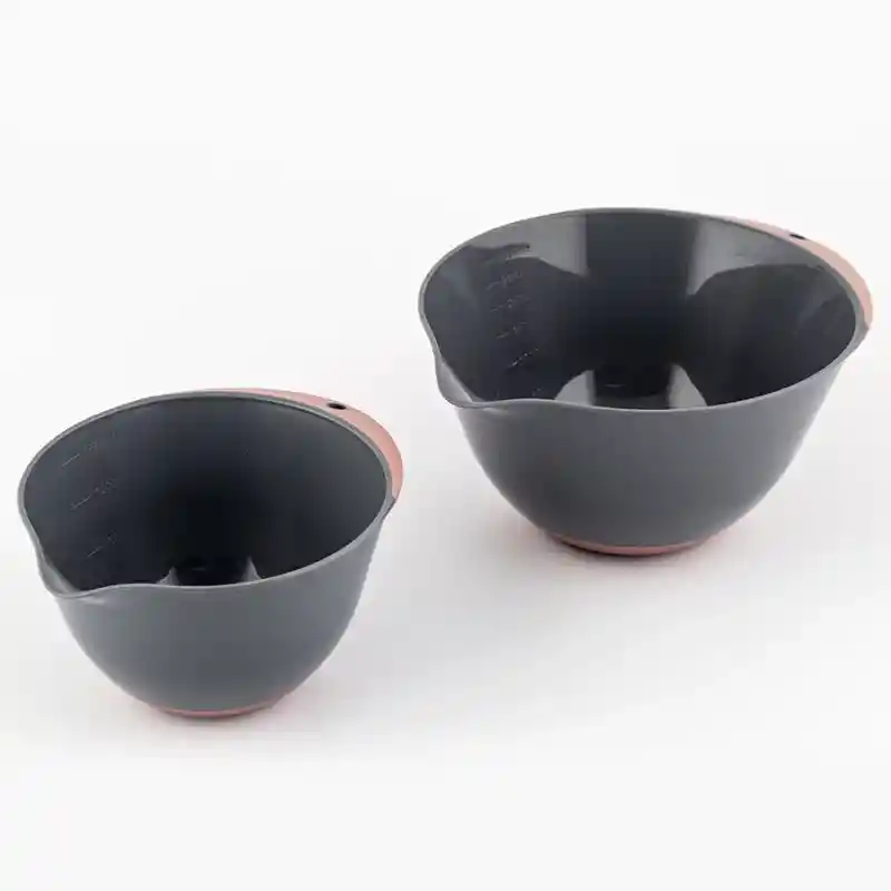 Setx2 Bowls Mexcladores en Plástico Ideal Para Batir y Mezclar Masas o Cremas de Sus Preparaciones Con Medidor y Boquilla Lateral Asa y Base en Silicona Para Uso Seguro. Marca: Expressions Medidas: Alto 12 cm x Ancho 15 cm Color: Gris y Ash Rose Este Producto es Marca Propia y su Garantía es Directa Con Home Sentry.