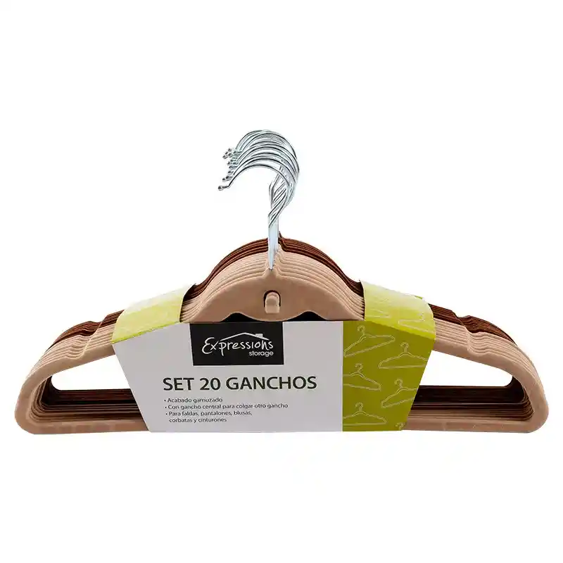 Set de 20 ganchos elaborados en aluminio. resistente. Tienen acabado gamuzado. Tienen gancho central para colgar otro gancho. Ideal para blusas, faldas, pantalones, corbatas o cinturones. Diez son de color café y diez de color beige. Resistentes. Modernos. Suaves al tacto. Elaborados en China.