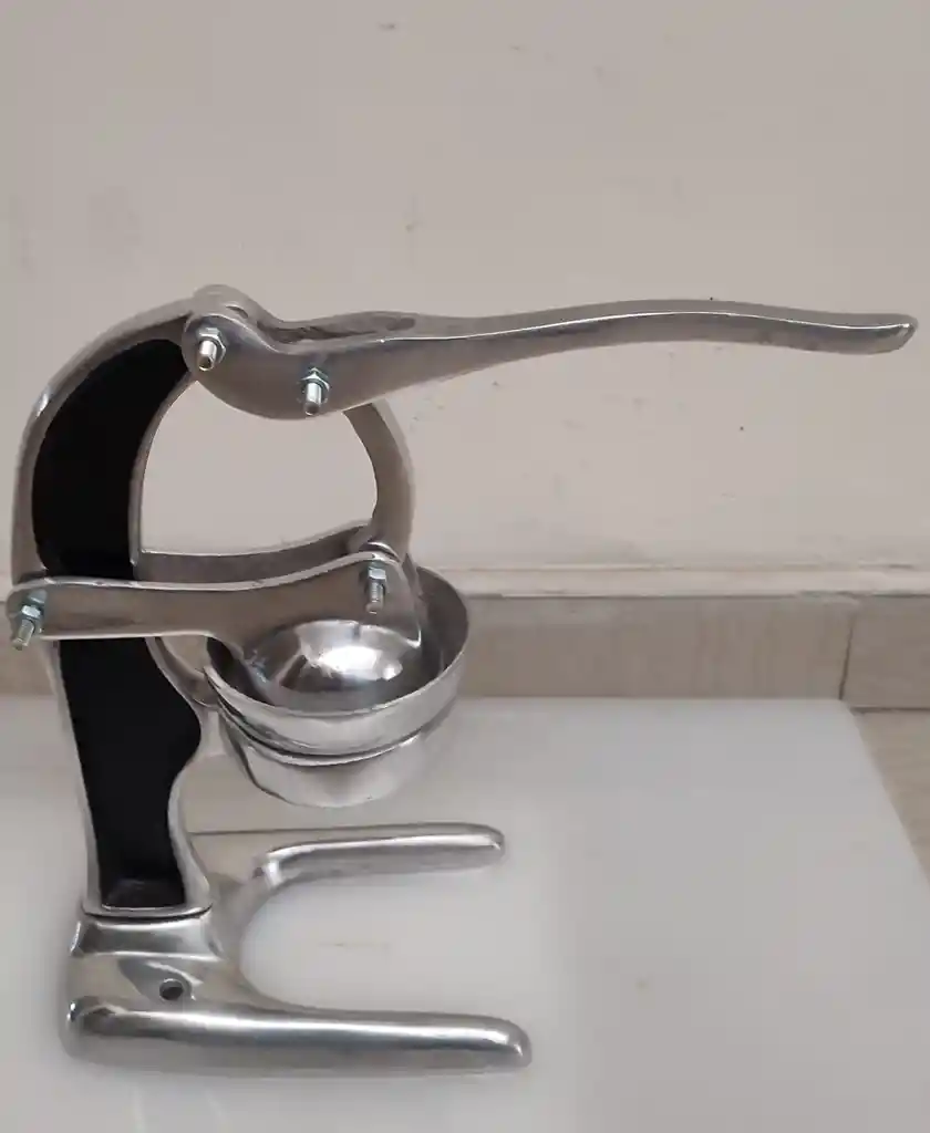 Exprimidor de naranjas industrial mediano, con palanca, exprime todo el jugo de la naranja. Con orificios para ajustar en la mesa; se debe ajustar para su buen funcionamiento. Medidas: alto 31, 5 cm; largo 27 cm, ancho 14 cm. Peso 1500 gramos
