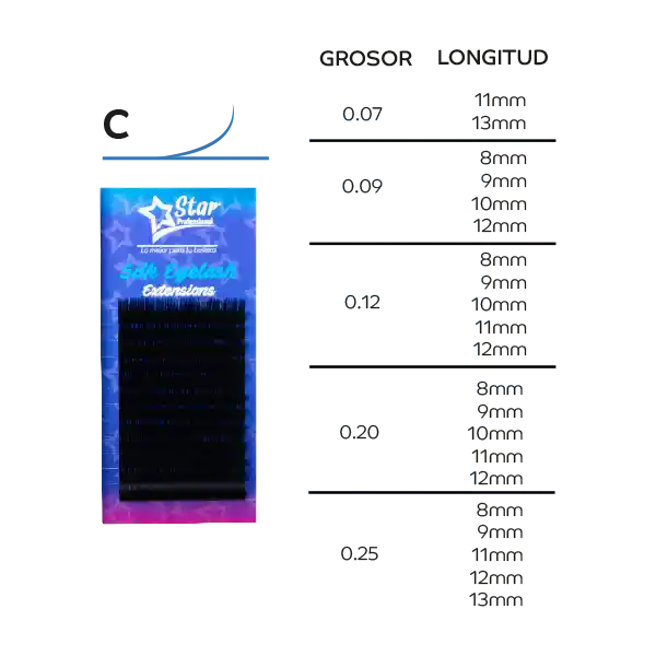 Extension de pestañas de practica curvatura C. Grosor: 0.07 Longitud: 11mm / 13mm Grosor: 0.09 Longitud: 8mm / 9mm / 10mm / 12mm Grosor: 0.12 Longitud: 8mm / 9mm / 10mm / 11mm / 12mm Grosor: 0.20 Longitud: 8mm / 9mm / 10mm / 11mm / 12mm Grosor: 0.25 Longitud: 8mm / 9mm / 11mm / 12mm / 13mm