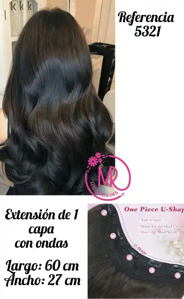 Largo: 60 cm. Ancho: 27 cm. Con 5 clips en acero inoxidable. Listas para aplicar. Se pueden lavar y planchar a baja temperatura (no mayor a 280C) Recomendaciones al lavar las extensiones. 1. Lavar con champú y tratamiento capilar. 2. Secar al aire libre como si fuera una prenda de vestir (no secar con secador y cepillo para no acortar su vida útil) 3. Planchar a baja temperatura (no mayor a 280C).