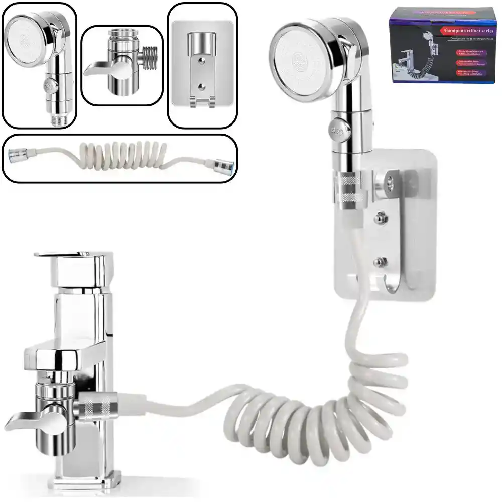 Extensor Lavamanos Ducha Flexible Grifo De Agua Alta Presion Convierte tu grifo convencional en una estación de lavado multifuncional en segundos. Este set de extensión es la solución perfecta para facilitar tareas cotidianas como lavarse el cabello, bañar mascotas o limpiar el lavamanos, sin necesidad de costosas remodelaciones. Características: - Cabezal de Ducha con Botón "Stop": Incluye un práctico botón de parada integrado en el mango, permitiéndote detener el flujo de agua al instante con una sola mano, ideal para ahorrar agua mientras te enjabonas. - Válvula Desviadora de Doble Control: Incluye un adaptador de grifo (tipo T) con una palanca que te permite alternar fácilmente entre la salida normal del grifo y la ducha de mano, sin tener que desconectar nada. - Manguera Flexible Retráctil: Cuenta con una manguera tipo resorte que se extiende para darte libertad de movimiento y se retrae para ahorrar espacio y mantener el orden cuando no está en uso. - Soporte de Pared: Incluye un soporte adhesivo para colocar la ducha en la pared. Su instalación es sencilla y no requiere herramientas. - Filtración y Alta Presión: Este sistema ofrece una salida de agua presurizada que mejora la limpieza y proporciona una experiencia de spa en tu lavamanos. El Kit Incluye: - Cabezal de ducha de mano cromado. - Manguera flexible en espiral. - Válvula desviadora para el grifo. - Soporte de pared adhesivo.