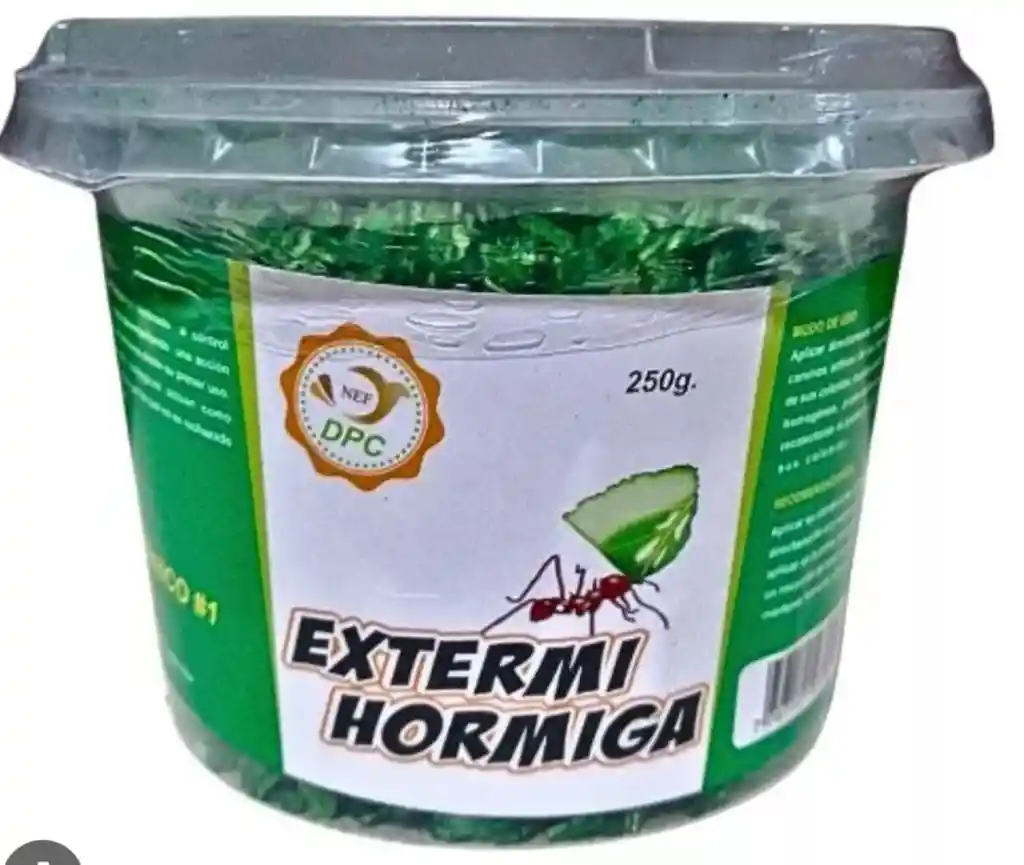 Extermin Hormiga x 250 gramos. Extermin Hormiga es un cebo de control biológico altamente eficaz está diseñado para el control integral de la hormiga arriera, garantizando una acción 100% efectiva dentro de las primeras 24 horas desde su inicial aplicación. Sus ingredientes biológicos se presentan como un atractivo alimenticio para las hormigas, garantizando así que no sea rechazado por ellas. MODO DE EMPLEO: Aplique el producto directamente desde el envase, evitando el contacto con las manos. Deposite el cebo en las rutas activas de las hormigas y en las cercanías de sus colonias, esparciéndolo de manera uniforme. es decir ( 2 o 3 montoncitos del cebo sobre los lados de todos los senderos por donde transitan las hormigas a una distancia mayor de 20 centímetros de la boca de entrada de hojas al hormiguero.) Las hormigas, atraídas por el producto, lo recogerán y lo llevarán de regreso a sus colonias.
