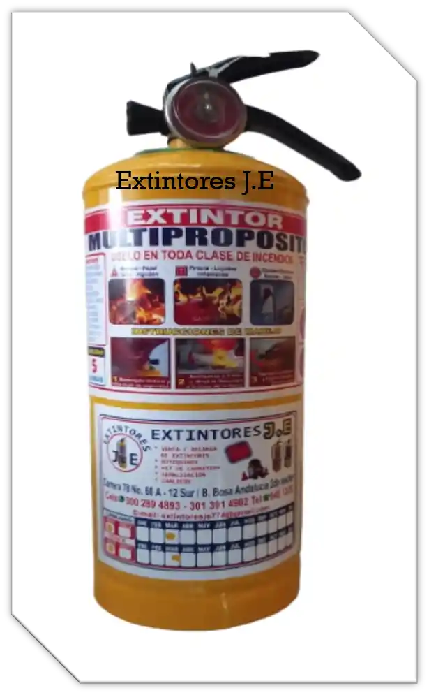 Extintor Multipropósito tipo ABC de 5 Libras Extintor multipropósito portátil polvo químico seco tipo ABC, para extinguir fuegos de clase ABC. A= Sólidos: Tela – Papel - Maderas B= Líquidos Inflamables – Combustibles – Grasas - Pinturas C= Equipos Eléctricos No es conductor eléctrico.