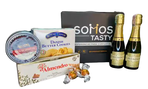 Este tasty regalo navideño incluye: 2 Chandon extra brut 187 mL torta de Amaretto turrón de Almendra 75 g galletas Royal Dansk de mantequillam bombones 3 und.