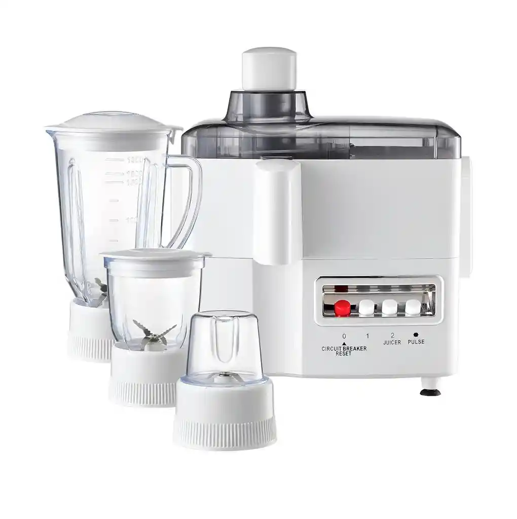 Este centro de nutrición integral 4 en 1 es la solución definitiva para transformar tu cocina, combinando un potente extractor de jugos, una licuadora de gran capacidad, un picatodo y un molino de granos en un solo equipo de alto rendimiento. Equipado con un robusto motor de 800W con protección contra sobrecalentamiento y cuchillas de acero inoxidable quirúrgico, permite extraer zumos puros, procesar batidos cremosos, picar carnes o vegetales y pulverizar granos con total eficiencia. Su diseño modular de piezas desmontables facilita una limpieza profunda en segundos, mientras que su panel intuitivo de 2 velocidades más función de pulso y su sistema de seguridad de restablecimiento automático garantizan un manejo seguro y resultados profesionales, convirtiéndolo en el aliado indispensable para una alimentación saludable y práctica. FICHA TÉCNICA Producto: Extractor de Jugos y Licuadora Multifuncional 4 en 1 Funciones: Extractor de zumos, Licuadora, Picadora y Molino de granos Potencia del motor: 800W de alta potencia Voltaje: 110V - 120V (Uso doméstico estándar) Velocidades: 2 Niveles ajustables + Función de Pulso Capacidad Jarra Licuadora: 1.5 Litros (Graduada) Material de cuchillas: Acero inoxidable de alta resistencia Seguridad: Protección térmica contra sobrecarga y botón de reinicio (Circuit Breaker) Material del cuerpo: Polímero ABS de alto impacto Piezas incluidas: Base de motor, unidad extractora, jarra de 1.5L, vaso picatodo, vaso molino y empujador de alimentos Características adicionales: Patas antideslizantes, boquilla antigoteo y piezas 100% desmontables Garantía: 1 mes por defectos de fábrica POLÍTICA DE GARANTÍA Y RETRACTO Este electrodoméstico cuenta con 1 mes de garantía por defectos de fábrica (fallas eléctricas o mecánicas de origen); por favor revise el producto al recibirlo, ya que no aplica retracto ni garantía tras su uso debido a que es un artículo que entra en contacto directo con alimentos. Dispone de máximo 5 días para reportar novedades (daños de transporte o piezas faltantes). Para cualquier devolución por garantía, es indispensable entregar el producto en su empaque original en buen estado, con todos sus accesorios y manuales completos.