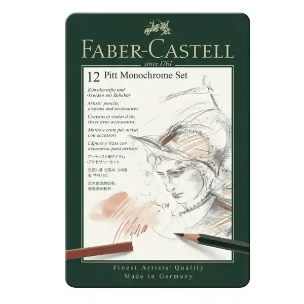 Estuche Con 12 Unidades. El Kit Para Principiantes de 12 Piezas en Estuche de Metal Con Calidad Profesional Incluye 1 Lápiz Castell 9000 2B, 1 Lápiz Pitt Graphite Puré 6B, 1 Carboncillo Pitt Medio, 2 Lápices Para Artistas Pitt Oíl Base (Negro Medio, Sanguina), 2 Lápices Pastel Pitt (Marrón, Blanco Blando), 4 Tizas Pastel Pitt, 1 Goma Moldeable Disponible de Manera Independiente y en Diferentes Tipos de Estuche