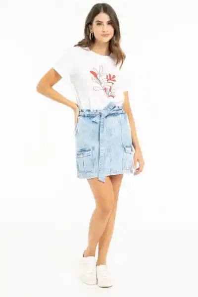 Corta en Denim Fondo Entero Elástico en Pretina Con Pasadores y Cinturón en la Misma Tela Bolsillos en Diagonal Bolsillos Parche en Delantero Con Tapa y Botón.