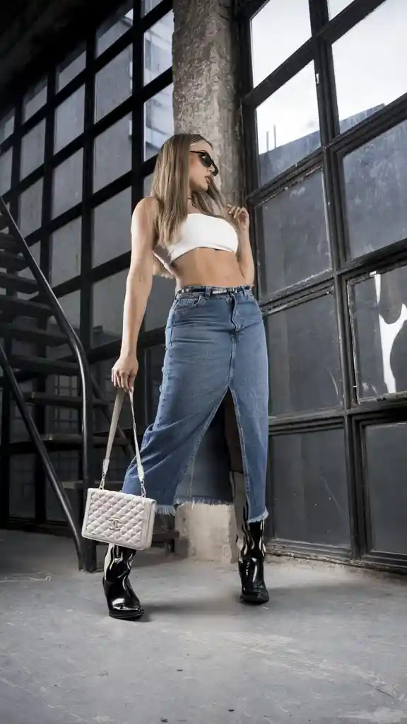 Falda en Jean stretch, tiro alto, pretina deslada y abertura en medio. Composición: 98% algodón / 2% Elastano